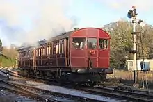 In June 2012, No. 93 was approved for main line operation, even though the re-introduction of wooden bodied vehicles had not been allowed for many years, and was subject to restrictions to reduce the possibility of collisions and any subsequent damage.[10] Since then No. 93 has run on various railways including the Bodmin and Wenford, the South Devon, and the Looe branch (Network Rail).[11][12]