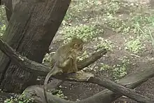 Gabon talapoins are the smallest of the Old World monkey and are considered as dwarf guenons.[8][9] They are large headed, and unlike the related Angolan talapoin, the Gabon talapoin has flesh-coloured (not blackish) ears and facial skin.[3][8] There are no distinct colour differences between mature males and females and the young.[8] The Gabon talapoin is short furred, and has a vivid, grizzled yellow-olive crown and back, with golden-yellow coating to its thin limbs, and a dark tipped tail.[7][8] Its eyelids and lips are yellowish in colour, with noticeable dark streaks on its nose and cheeks.[8] They also have cheek pouches that are useful for storing food.[10] Females have a pink sexual swelling, and males are characterized by their large pale blue scrotum.[7]