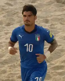 Gori recovered from knee surgery in time to be called up to the Italian team for the 2011 FIFA Beach Soccer World Cup in Ravenna.[4] Subsequently, Gori was the joint second top scorer of the 2015 World Cup[6] and helped Italy win the gold medal at that year's Mediterranean Beach Games,[4] Italy's first major honour since 2005.[7] In 2016, Gori was voted as one of the three best players in the world at the annual Beach Soccer Stars awards[8] and won the Pallone Azzurro (Blue Ball) award for best Italian player of the year bestowed by the Italian Football Federation.[9] His biggest individual accolade came six months later at the 2017 World Cup, where he won the Golden Boot (top scorer) with 17 goals[10] and his 12 goals during the 2018 EBSL season helped Italy secure their first European crown in 13 years, ending 2018 on the verge of 200 goals for Gli Azzurri.[7] A year later, Gori was once again named one of the world's best three players and named amongst the dream team for 2019 at the Beach Soccer Stars awards[8] and ended the season with a silver medal at the 2019 World Cup, winning the Golden Boot once again, the first player to win consecutive top scorer awards since Madjer in 2005 and 2006.[11] He was also named as one of the tournament's top ten best players, out of the 192 participants.[12]