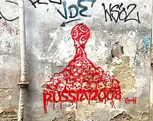 Gagosh is the pseudonym of a Tbilisi, Georgia-based street artist who creates stencils, installations, street poetry and mosaics. His work protests social issues such as the shortage of green space in Tbilisi, labor rights, unemployment, air pollution, social stigmas, the inconvenience of Tbilisi streets for disabled people, exceeded politics and lack of love in society.[1][2][3][4][5][6][7][8][9][10][11]