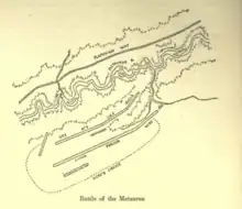 Polybius gives a detailed description of the events of the battle, particularly the death of Hasdrubal and the strategy used by Claudius to seize the overall victory.[42] Hasdrubal was followed by Roman legions led by Claudius as he was attempting to meet up with his brother Hannibal in Italy.[41] Hasdrubal sent out messengers outlining the meeting point; these dispatches were intercepted by the Romans, providing them with the means to adopt an offensive approach now that they knew the plans. Claudius had been camped close to Hannibal, in a strategic position. He was stationed further south than his colleague and co-consul M. Livius Salinator, and he set off to march north to join Livius and eventually reach Hasdrubal near the Metaurus River.[43] He left most of his army to keep watch, and joined up with Livius at night. After Hasdrubal realized there were two Roman consuls in the same camp, he decided to retire until he could make contact with his brother. Claudius was commanding from the right wing of the Romans; however he was obstructed by a ravine and couldn't get around. Ingeniously Claudius marched his troops behind the Roman lines to emerge in a surprise attack behind Hasdrubal's forces.[42] Livy described this battle as a disaster for the Carthaginians, with around 56,000 troops dead.[44]