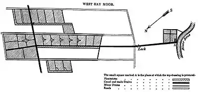 The River Brue provided a source of soil for top dressing, as rich soil was deposited on its banks after heavy rainfall.[4] It is not known when construction of the canal began, as Galton makes no mention of it in his article, and costs for the whole project are shown starting in 1811. However, the first carriage of soil is shown in 1822, when 90 cubic yards (69 m3) passed along the canal, so it must have been finished by this time.[5] The canal had been authorised by the Brue Drainage Act of 1801. It was about 1.4 miles (2.3 km) long and 16 feet (4.9 m) wide. The section which joined the River Brue was embanked on both sides, after which there was a small lock,[6] which raised the level of the canal to allow it to cross the moor.[4] It joined the North Drain at the far end, and continued a little further to service land being reclaimed on the north side of the drain.[7]