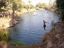 Gan HaShlosha National Park (Hebrew: גן השלושה, literally: "Park of the three"), also known by its Arabic name Sakhne (Arabic: الساخنة, literally: "The hot [pool]"), is a national park in Israel. Located between kibbutzim Beit Alfa and Nir David, it has naturally warm water where visitors can swim all year. It is named in memory of three Jewish pioneers who came to survey the land on behalf of the Jewish National Fund in 1938, when their car rode over a land mine and all three were killed.[1]