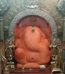 A recently built sabha-mandapa (assembly-hall) has idols of god Vishnu and his consort Lakshmi. It leads to central hall built by the Patwardhan Rulers of Kurundwad. The ceiling of this hall is formed from a single stone. The garbhagriha (sanctum sanctorum) has a central image of Ganesha as Mayureshwar or Moreshwar, facing the North. The Ganesha image is depicted in a seated posture with its trunk turning to the left, four arms and three eyes. He holds a noose (pasha) and elephant goad (ankusha) in his upper hands, while his lower right rests on his knee and the other one holds a modaka (a sweet). The navel and the eyes are embedded with diamonds. A cobra hood raised over Ganesha's head, shelters the Lord.[3][5] The image is actually smaller than it looks as it is smeared with a thick level of saffron-coloured Sindoor (vermillion), which peels off once every century. It last fell off in 1882, and prior to that in 1788.[1][3] Ganesha is flanked by idols of his consorts Riddhi and Siddhi sometimes called Siddhi and Buddhi.[1][5] These idols are made of an alloy of five metals or of brass.[1][5] The deities are covered with crafted silver and gold.[1] Like all Ashtavinayaka shrines, the central Ganesha image is believed to be svayambhu (self-existent), naturally occurring in the form of an elephant-faced stone.[13] In front of the central image, the vahanas of Ganesha – the mouse and the peacock are placed.[5] To the left outside the garbhagriha is an image of Nagna-Bhairava.[14]