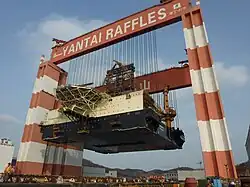 Some full gantry cranes of note are Samson and Goliath and Taisun. Samson and Goliath are two full gantry cranes located in the Harland and Wolff shipyard in Belfast. They have spans of 140 metres (460 ft) and can lift loads of up to 840 tonnes (830 long tons; 930 short tons) to a height of 70 metres (230 ft). In 2008, the world's strongest gantry crane, Taisun, which can lift 20,000 tonnes (19,700 long tons; 22,000 short tons), was installed in Yantai, China at the Yantai Raffles Shipyard. In 2012, a 22,000-tonne (21,700-long-ton; 24,300-short-ton) capacity crane, the "Honghai Crane" was planned for construction in Qidong City, China and was finished in 2014.[3]