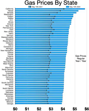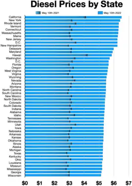 In 2021-22, gasoline and diesel prices surged in the United States, reaching record highs, as part of a larger trend of inflation.[36] The average price of regular gasoline rose from $1.773 during the week of April 27, 2020, to $5 as of June 11, 2022, an all-time high.[37] California led the nation in gas prices with an average gallon of regular gas in the state reaching $6.43 as of June 11, 2022.[38]