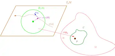 where is the unique geodesic with and tangent and is chosen small enough so that for every the geodesic is defined. So, if is complete, then, by the Hopf–Rinow theorem, is defined on the whole tangent space.