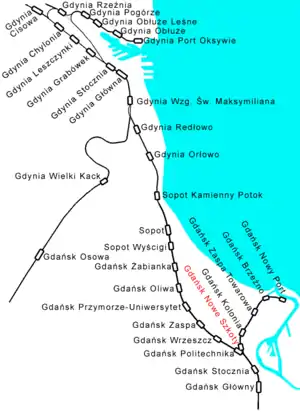 The line connecting Gdańsk Główny (Danzig Hbf.) with Gdańsk Nowy Port (Danzig Neufahrwasser) was opened in October 1867. It had been electrified in 1951, but the voltage was changed (from 800 V) into standard 3 kV in 1973. The line served mostly as the transport route for shipyard workers who commuted to the Gdańsk Shipyard. On December 15, 2002, the line was shortened to reach only Gdańsk Brzeźno. On June 25, 2005, the line was completely closed for passenger service.