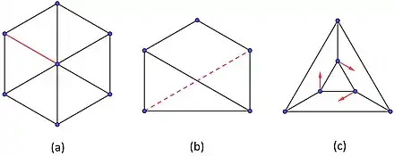 Step 1 sets up the generic setting of rigidity so that we can focus on generic infinitesimal rigidity rather than generic rigidity. This is an easier approach, because infinitesimal rigidity involves a system of linear equations, rather than quadratic in the case of regular rigidity. In particular, we can prove structural properties about the rigidity matrix of a generic framework. These results were first proved by Asimow and Roth,[9][10] see Combinatorial characterizations of generically rigid graphs. Note that in Step 1.4 the framework must be generic with respect to infinitesimal rigidity. In particular, a framework that is rigid and generic with respect to rigidity is not necessarily infinitesimally rigid. Step 2 is the Maxwell Direction of the proof, which follows from simple counting arguments on the rigidity matrix. Step 3 shows that generically minimally rigid graphs are exactly the graphs that can be constructed starting from a single edge using two simple operations, which are defined below. Step 4 shows that graphs with this type of construction are generically infinitesimally rigid. Finally, once Step 1 is proved, Steps 2-3 prove the Geiringer-Laman theorem.