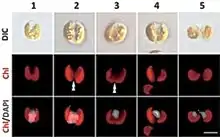 | Guillardia theta. DAPI-staining images showing the representative cells of cell cycle stages based on the localization of the nucleus and the shape of the chloroplast. DIC, images of differential interference contact; Chl, chloroplast autofluorescence; Chl/DAPI, merged images of Chl and DAPI. The double arrowhead indicates constriction of the chloroplast division site. Scale bar = 5 µm | |