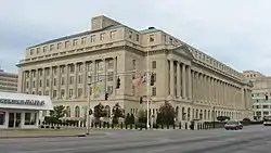 Encompassing an entire city block, the rectangular building rises six stories (the fifth floor is concealed on the exterior behind the limestone entablature). The facade (south elevation) facing Broadway features a row of 18 engaged Corinthian columns with fluted shafts poised upon a rusticated base of arched windows aligned with the fenestration above. The colonnade is framed at each end by projecting pavilions, each with four columns and crowning pediments. The secondary east and west elevations are composed of 12 colossal Corinthian columns to match those of the facade.[2]