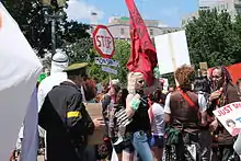 The March Against Monsanto is an international grassroots movement and protest against Monsanto corporation, a producer of genetically modified organism (GMOs) and Roundup, a glyphosate-based herbicide.[80] The movement was founded by Tami Canal in response to the failure of California Proposition 37, a ballot initiative which would have required labeling food products made from GMOs. Advocates support mandatory labeling laws for food made from GMOs .[81]