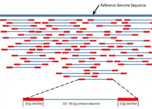 Shotgun sequencing is a sequencing method designed for analysis of DNA sequences longer than 1000 base pairs, up to and including entire chromosomes.[52] It is named by analogy with the rapidly expanding, quasi-random firing pattern of a shotgun. Since gel electrophoresis sequencing can only be used for fairly short sequences (100 to 1000 base pairs), longer DNA sequences must be broken into random small segments which are then sequenced to obtain reads. Multiple overlapping reads for the target DNA are obtained by performing several rounds of this fragmentation and sequencing. Computer programs then use the overlapping ends of different reads to assemble them into a continuous sequence.[52][53] Shotgun sequencing is a random sampling process, requiring over-sampling to ensure a given nucleotide is represented in the reconstructed sequence; the average number of reads by which a genome is over-sampled is referred to as coverage.[54]