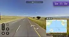 The game's HUD primarily features the Google Street View imagery, as well as a compass. Users can control the movement, panning, and zooming of the image, although GeoGuessr allows any of these features to be disabled for harder gameplay.[14] An inset map, using Google Maps's standard overlay, allows players to place a pin to make their guess.