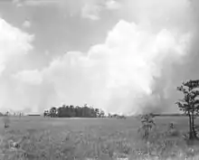 Fire is another important element in the maintenance of the Everglades. The majority are caused by lightning strikes from thunderstorms during the wet season. Their effects are largely superficial, and serve to foster further plant growth: sawgrass will burn above water, but the roots are preserved. Fire in the sawgrass marshes serves to keep out larger bushes and trees, and releases nutrients from decaying plant matter more efficiently than decomposition.[20] Large burned areas also affect waterflow, since wind and water are undeterred by the eradicated sawgrass; water may flow two to three times faster in recently burned areas.[21] During the wet season only dead plant matter and the tips of plants are burned; however, the effects of fire are much more significant in the dry season, as fire may be fed by organic peat and burn deeply, destroying root systems. The only impediment to the spread of fire in the Everglades is the presence of water. It takes around 225 years for one foot (0.3 m) of peat to develop, but the peat is not as dense as it should be for the 5,000 years of the Everglades' existence. Scientists point to fire as the reason.[3]