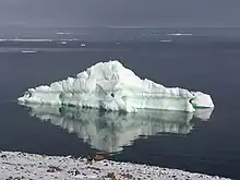 Hall Island (Ostrov Gallya) is an almost completely glacierized large island of 1,049 km2 (405 sq mi) immediately to the east of MacKlintok Island. It lies within latitude 80.30° N and longitude 56.00° E. The highest point on the island is 502 m (1,647 ft) and its mapped shore length is 174.7 km (108.6 mi).[10][22] It was named after American Arctic explorer Charles Francis Hall. The only relatively large areas free of permanent ice are located in its southern end, where there are two headlands, Cape Tegetthoff, and Cape Ozernyy, on the Littov Peninsula. Cape Tegetthoff has a range of hill peaks.[7] The airborne surveys revealed 400 metres (1,300 ft) thick mantles of ice and also in Graham Bell Island's ice capes.[23] There is also a very small unglacierized area around its eastern cape, Cape Frankfurt, and another in its northwestern point, Cape Wiggins. Its highest point is 502 m (1,647 ft) near its southwestern side, and there is also a peak of 421 metres (1,381 ft) in the northcentral part of the island. There is a wide bay on the southeastern side of Hall Island known as Hydrographer Bay and a smaller one west of the Littov Peninsula, known as Bukhta Surovaya.[7] To the southeast, there is a wider strait separating Hall Island from Salm Island, known as Proliv Lavroka. The strait to the east is known as Austrian Strait.