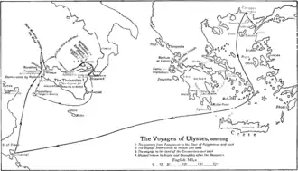 The modern Greek Homerist Ioannis Kakridis may be compared with Eratosthenes in his approach to the problem. He argued that the Odyssey is a work of poetry and not a travel log. To attempt a quick outline of Kakridis's views, it is useless to try to locate the places mentioned in Odysseus' narrative on the map; we cannot confuse the narrative of Odyssey with history unless we believe in the existence of gods, giants and monsters. Kakridis admits that one may indeed ask what real locations inspired these imaginary places, but one must always bear in mind that geography is not the main concern either of Odysseus (as narrator) or of the poet.[29] Similarly, Merry and Riddell, in their late-19th century school edition of the Odyssey, state the following opinion: "Throughout these books [books 9-12] we are in a wonderland, which we shall look in vain for on the map".[30] W. B. Stanford, in his mid-20th century edition, comments as follows on book 9 lines 80-81 (where Odysseus says that he met storms off Cape Malea near the island of Cythera): "These are the last clearly identifiable places in O.'s wanderings. After this he leaves the sphere of Geography and enters Wonderland ..."[31] Thereafter, while frequently referring to ancient opinions on the location of Odysseus's adventures, Stanford makes little or no reference to modern theories.
