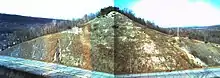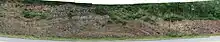 Roadcut along Rt. 30 (Everett bypass) through Warrior Ridge, showing the lower Devonian sequence from the Corriganville Limestone at left to the Ridgeley Sandstone to the Needmore Shale at right, and Tussey Mountain in background at left.
