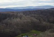 View of water gaps cut by the Raystown Branch of the Juniata River through Evitts Mountain and Tussey Mountain, facing west from the summit of Kinton Knob, Wills Mountain, in Bedford County, Pennsylvania, with the town of Bedford in the foreground.