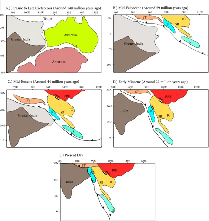 The rifted Burma-microplate from Gondwanaland also docked against Shan-Thai block and together formed part of the Sunda plate approximately in the period.[15] There is a discrepancy for the time of the Burma-Shan-Thai collision: Mitchell (1989) says Early Cretaceous yet changes to Mid-Eocene in 1993;[18] Hutchison (1989) says Late Cretaceous;[28] and Acharyya (1998) says late Oligocene.[29]