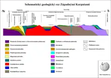The Western Carpathians are separated from the Alps by the valley of the river Danube (only from the geographical point of view; the geological boundary is the so-called Carnuntum gate) and the Raaba line.[1] To the east, the boundary with the Eastern Carpathians is placed formally in the valley of the river Uzh, but many tectonic divisions consider the Hornád fault system on the line Košice – Prešov the real geological boundary.[1] The northern boundary is the thrust front that separates the nappes from the Carpathian Foredeep. In the Czech Republic the line Znojmo-Přerov-Karviná approximately forms the western boundary of the Western Carpathians.[2] The southern boundary is not distinct (because of the interfingering boundary between the Carpathians and lowlands of the Pannonian Basin). According to some views it is south of the Bükk and Mátra mountains in Hungary.