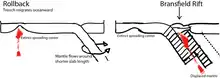 The trenchward migration of the spreading center is attributed to the subduction of the Phoenix Plate under the Antarctic Plate.[2] Slab rollback and South Shetland Trench oceanward retreat have led to extensional forces acting on the leading edge of the overriding plate.[2] The Bransfield Strait, the result of this extension, is presumed to be four million years old or less;[2] magnetic anomalies created by the formation of new basaltic crust[6] and aligned with the axis of the Bransfield Rift[2] indicate that the newly formed oceanic crust in the Bransfield Strait is roughly 1.3 million years old.[2] Unfortunately the deposition of sediments and extensive intrusions into the rift render computer modeling unreliable.[2] Isolated occurrences of terrestrial volcanic activity are present, and are predominantly alkaline to tholeiitic in composition.[6]