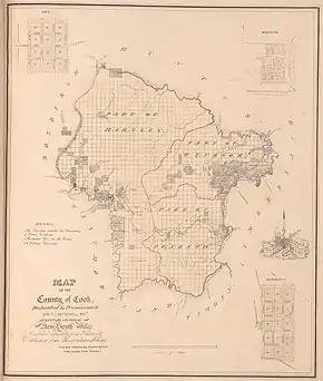 In February 1842, Bowen had obtained title over 83 acres in the County of Cook.[39] This was the foundation of Bowen's landholding, 'Bowen Mount', at what would become later be known as Bowen Mountain. It would become his family's home, once he returned to New South Wales and built a substantial timber house, on the highest ridge. The house was surrounded by ornate gardens and orange orchards. He had acquired another 303 acres in 1847.[44][21][45]