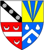 - 2nd: Or, three piles in point azure (Bryan of Tor Bryan, Devon, for Jane de Bryan, a daughter and co-heiress of Sir Guy de Bryan (died 1396) of Tor Bryan, Devon, wife of Sir John Cary;[14]