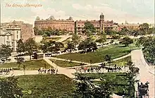 In the course of his career Dawson "erected several handsome blocks of buildings", which included the Britannia Buildings adjoining the Crown Estate, Prospect Crescent in James Street, Cambridge Crescent in Parliament Street, and "numerous others".[7][16][17] Some of those others are buildings in Parliament Street including Fattorini the Jeweller (1866–1868),[16][18][19] numbers 3–29 Swan Road (1881–1886),[16] and James Street including Ogden's jewellers,[11]:631,632[20] his residence Vanderbilt Court at 5 Victoria Avenue, 2–24 Crescent Road (Grosvenor Buildings), the wings of the Crown Hotel,[13] the block facing Victoria Park and Princes Square, and the block next to the Sulphur Well. He also built several villas in West End Park.[2][21] Some of these are now listed buildings, for example, 1–10 Prospect Crescent,[22] and 2–6 Crescent Road.[23]