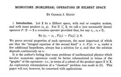 The beginning of Minty's article Monotone (nonlinear) operators in Hilbert space, published in Duke Mathematical Journal, 1962