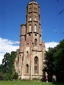 In 1837 a programme of budget cuts at the Admiralty led to Taylor's dismissal. He took up general practice, and qualified as a district surveyor.[5] In 1838 he began the spectacular Gothick tower at Hadlow Castle, a late eighteenth century house in Kent. The tower was based in part on James Wyatt's at Fonthill Abbey. It was built of brick rendered in Roman cement to imitate stone, the finer architectural detail built up with the cement.[6] He had previously used the Gothick style at a church in Walham Green, Fulham in 1827-8.[7]