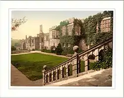 Vernon had two daughters, Margaret (born c. 1540) and Dorothy (c. 1545 – 1584) by a first wife, Margaret, the daughter of Sir Gilbert Talbois.[3] His second wife was Maude, the daughter of Sir Ralph Longford, whom he married in the 1550s. In 1558, Margaret married Sir Thomas Stanley, a son of the 3rd Earl of Derby. Dorothy fell in love with John Manners (c. 1534 – 4 June 1611), the second son of Thomas Manners, 1st Earl of Rutland. Dorothy and John Manners were married in 1563;[4] there is evidence that Manners's brother-in-law, George Talbot, encouraged the match. Nevertheless, a legend grew up in the 19th century concerning a supposed elopement between Dorothy and John, and this legend has become the source of many novels, dramatisations and other fictional works.[5] If indeed the elopement happened, the couple were soon reconciled with Sir George Vernon, as they inherited Haddon Hall and half of the estate on his death two years later, and John was Sir George's executor.[6][7]
