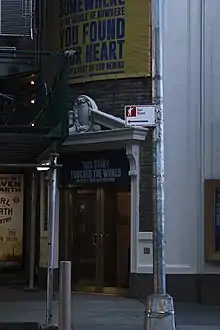 The ground floor of the auditorium contains a water table made of granite.[21] The rest of the facade is largely made of architectural terracotta, which surrounds patches of buff brick in Flemish bond.[12][21] Along the ground floor on 45th Street, there are three glass-and-bronze double doors with aluminum frames and transoms, which lead to the lobby. There are display boxes on either side of the lobby doors, and a bronze stage door is to the right (west) of these doors. A marquee extends above the doors.[22] The northeastern corner of the facade is curved and contains an entrance to the ticket lobby. This entrance contains a double door, above which is a glass transom panel. The corner entrance is topped by a broken pediment, which is supported by console brackets on either side and contains an escutcheon at the center.[23][24]