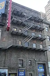 The stage house is six stories high. The 45th Street facade is made of buff brick, containing interspersed diamond patterns, and the side walls are faced with plain brick. The ground floor of the stage house contains a granite water table with two metal doors. The western door is double-height, allowing large sets to be transported into the theaters, while the eastern door contains signboard panels. The stage house has five sash windows on each of the third through sixth stories. These windows are placed within segmental arches made of brick. There is a metal fire escape in front of the stage house, which leads to the fire escape in front of the auditorium's third story. A parapet with corbels runs above the sixth story of the stage house.[23][24]