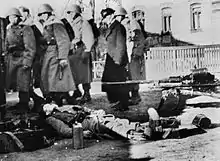 At about 07:50 on the southern outskirts of Haderslev, a Danish 37 mm anti-tank gun with a crew of five attacked the approaching armour.[19] Two German tanks lined up adjacent to one another and opened fire. The Danes landed all three of their shots—one in a tank's tracks—but two of the gun crew were killed and the rest wounded. One tank then drove over the gun. Around the curve on Sønderbro Street, two 20 mm cannon and a machine gun put up resistance at the wagon roadblock. The Germans laid down heavy fire. A Danish soldier was killed and two were wounded, but the Germans were effectively pinned down.[20] The fighting continued for ten minutes until the order to surrender was received from Copenhagen (København) by telephone. The Germans were then allowed to proceed into Haderslev, but the Danish garrison stationed there had not received the order to surrender and fired on them. Two German tanks and a motorcycle proceeded unsuspecting towards the barracks, which were defended by the anti-tank unit from Lundtoftbjerg.[14] They opened fire, killing the motorcyclist and blowing the tracks off one tank, sending it crashing into a house. However, the Danish garrison capitulated at 08:15 when the order to surrender finally came through.[14] One Danish soldier was killed while defending the barracks,[14] and three civilians were killed in the crossfire.[21]