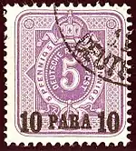 Starting in 1884, stamps began to be issued with overprints restating the stamp's face value in the Turkish denominations, i.e. piasters and paras. The overprint did not include an additional country name, as was the case with stamps issued for use at the German post offices in Morocco and China.