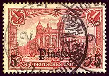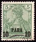 The German post offices abroad were a network of post offices in foreign countries established by Germany to provide mail service where the local services were deemed unsafe or unreliable. They were generally set up in cities with some sort of German commercial interest. In early use only the cancellation mark can identify their postal use abroad; such stamps are known as "Vorläufer" (forerunner) stamps.[1] Later stamps are identified by overprints even when not postally used. German abroad stamps started appearing in the late 19th century and reached their heyday at the beginning of the 20th century; they closed down during or shortly after World War I.