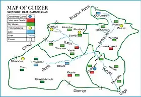 The Ghizer District (Urdu: ضلع غیزر) is a district of Pakistan-administered Azad Kashmir in the disputed Kashmir region.[1] It is one of the 14 districts of the Pakistan-administered territory of Gilgit-Baltistan. The former Ghizer District that existed from 1974 to 2019 spanned the entire upper Gilgit River Valley (also known as the Ghizer River Valley). In 2019, the former district was divided into the Gupis-Yasin District in the west and the present, smaller Ghizer District in the east.[2]