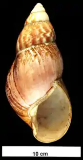 Lissachatina fulica is a species of large land snail that belongs in the subfamily Achatininae of the family Achatinidae.[1] It is also known as the Giant African land snail.[2] It shares the common name "giant African snail" with other species of snails such as Achatina achatina and Archachatina marginata. This snail species has been considered a significant cause of pest issues around the world. Internationally, it is the most frequently occurring invasive species of snail.[3]