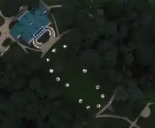 The installation consisted of 39 circles mowed on the field and a woman in a white dress spinning in each circle. This installation was accompanied by traditional Hungarian music and dance, a craft fair and horseback archery exercises led by master Lajos Kassai. Hundreds of people camped in the valley to visit the Giant Steps event.[4][5]