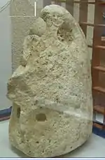Still in the time-frame of the Prenuragic age, but in this case during the Eneolithic period, there is a remarkable production of "Laconi-type" statue-menhirs or statue-stelae, assigned to the Abealzu-Filigosa culture and characterized by a uniform tripartite scheme encompassing, from top to bottom: a stylized T-shaped human face; the depiction of the enigmatic capovolto (the capsized) in the kind of trident capovolto; and a double-headed dagger in relief.[11][20]