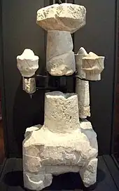 Still in the time-frame of the Prenuragic age, but in this case during the Eneolithic period, there is a remarkable production of "Laconi-type" statue-menhirs or statue-stelae, assigned to the Abealzu-Filigosa culture and characterized by a uniform tripartite scheme encompassing, from top to bottom: a stylized T-shaped human face; the depiction of the enigmatic capovolto (the capsized) in the kind of trident capovolto; and a double-headed dagger in relief.[11][20]