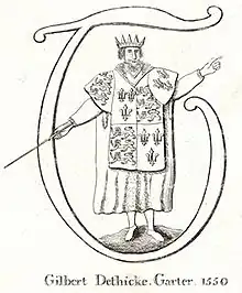 Sir Gilbert Dethick FSA (c. 1510 โ 3 October 1584) was a long-serving English officer of arms at the College of Arms in London. He would eventually rise to the highest heraldic office in England and serve as Garter Principal King of Arms.