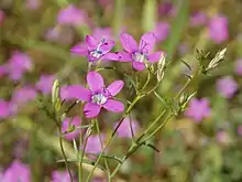 The top of the stem is an inflorescence of a few pink to lavender flowers with yellow and white throats. The base of the flower is a thin, glandular tube.