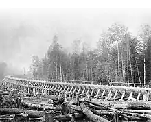 The system Gilmour employed was the construction of a "tramway". At the base of Lake of Bays Gilmour would construct a jackladder, a conveyor mechanism that carried the logs up the hillside. At the top Gilmour then would construct a log slide. Filled with flowing water, the log slide would float the timber to a damn. Once at the damn a second jackladder would carry the logs to the mouth of Lake Raven. Jackladders and log slides were not new ideas, the lumber industry had been using them for decades. David Gilmour's feat of engineering genius was putting the existing technologies together.[10]
