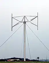 Darrieus's 1927 patent also covered practically any possible arrangement using vertical airfoils. One of the more common types is the H-rotor,[1][2][3] also called the Giromill or H-bar design, in which the long "egg beater" blades of the common Darrieus design are replaced with straight vertical blade sections attached to the central tower with horizontal supports. This design is used by Shanghai based MUCE.[4][5]