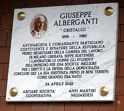 In front of a large audience and several partisans from the ANPI, on April 23, 2022, a plaque dedicated to Giuseppe Alberganti, codenamed "Cristallo", was unveiled.[4] The plaque is located on a wall at Via Val di Ledro 23 in the historic district of Niguarda in Milan, where Alberganti lived until his death. The Niguarda district made a significant contribution to the Italian Resistance, fighting against the fascists and Nazis.[5][6]