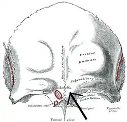 Frontal bone, outer surface, (glabella visible near bottom of bone)