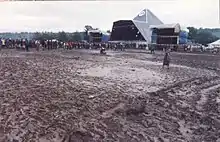 Since 1983, large festivals have required licences from local authorities. This led to certain restrictions being placed on the festival, including a crowd limit and specified times during which the stages could operate. The crowd limit was initially set at 30,000 but has grown every year to over 100,000.[26] 1984 saw the stage invaded by children during The Smiths set.[27][28] Weather Report played the main stage, and Elvis Costello headlined the last night for almost three hours.[29] In 1985, the festival grew too large for Worthy Farm, but neighbouring Cockmill Farm was purchased.[30] That year saw a wet festival with considerable rain; Worthy Farm is a dairy farm and what washed down into the low areas was a mixture of mud and liquefied cow dung. This did not prevent festival-goers from enjoying the knee-deep slurry in front of the pyramid stage.