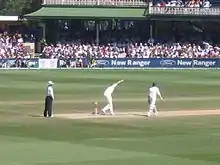 McGrath's bowling was not of express pace. Rather, he relied on unerring accuracy and subtle seam movement, which he derived from his high wrist action and lengthy follow-through.[23][24] His height (195 cm), combined with a high arm action, allowed him to extract extra bounce, which often surprised batsmen. In the later years of his career he developed as a swing bowler.[25]